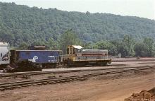 CR SW-9 9016 (ex-EL 440) teams up with NE-6 cabin 23813 (ex-PC 19819) to work Allentown yard in July, 1979.