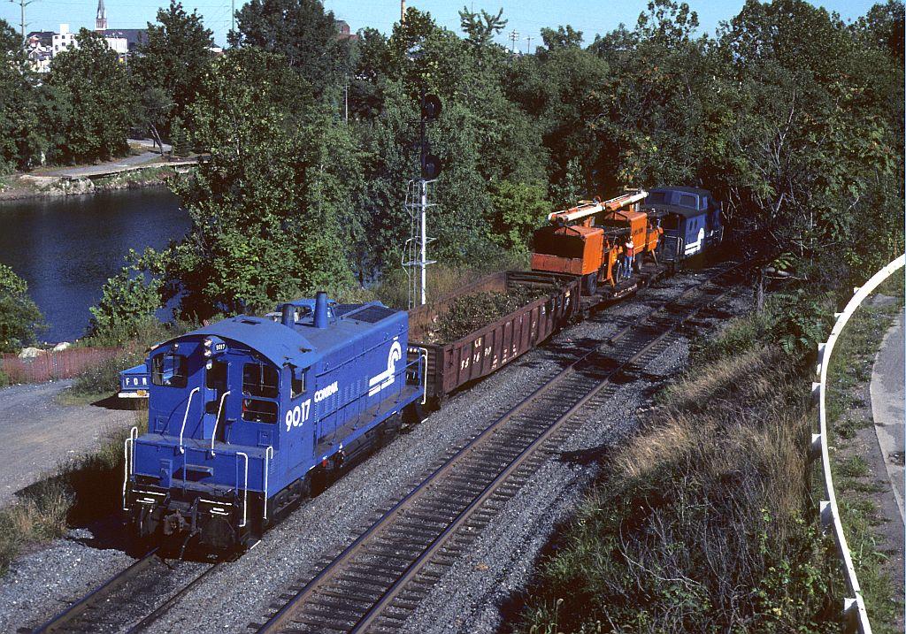Tree trimming 1981, Conrail style. Load up the contractor's trucks on a flat and head out. This little work train is returning to Allentown yard with SW-9 9017, the former EL 446, and an ex PRR N5C on ex CNJ rails IIRC.