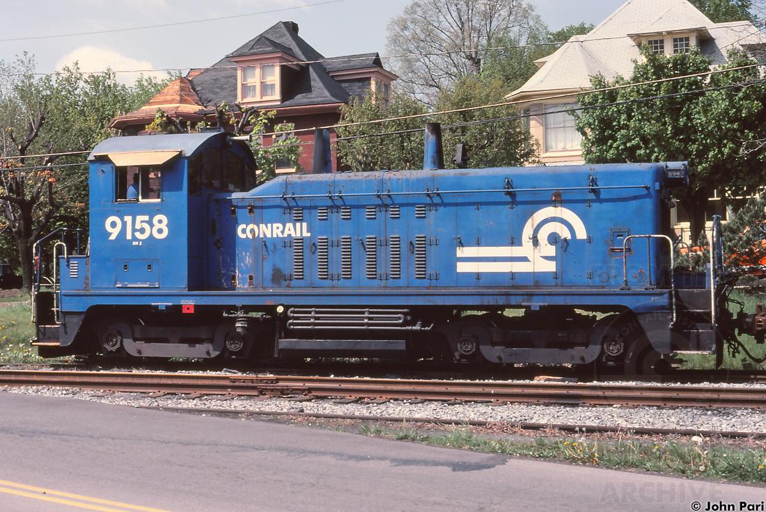 Former PC 9158, rebuilt from NW2 PC/NYC/IHB 8733, is seen at Roaring Spring, PA on 5/17/1983.