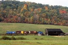 When most of us, me included, look back at Conrail, we think of large trains and good track...big time railroading. There was another side to Conrail. On Oct. 1, 1982 a southbound freight slowly rolls along on the Bedford Secondary south of Queen, PA w/ NW2 No. 9158.
