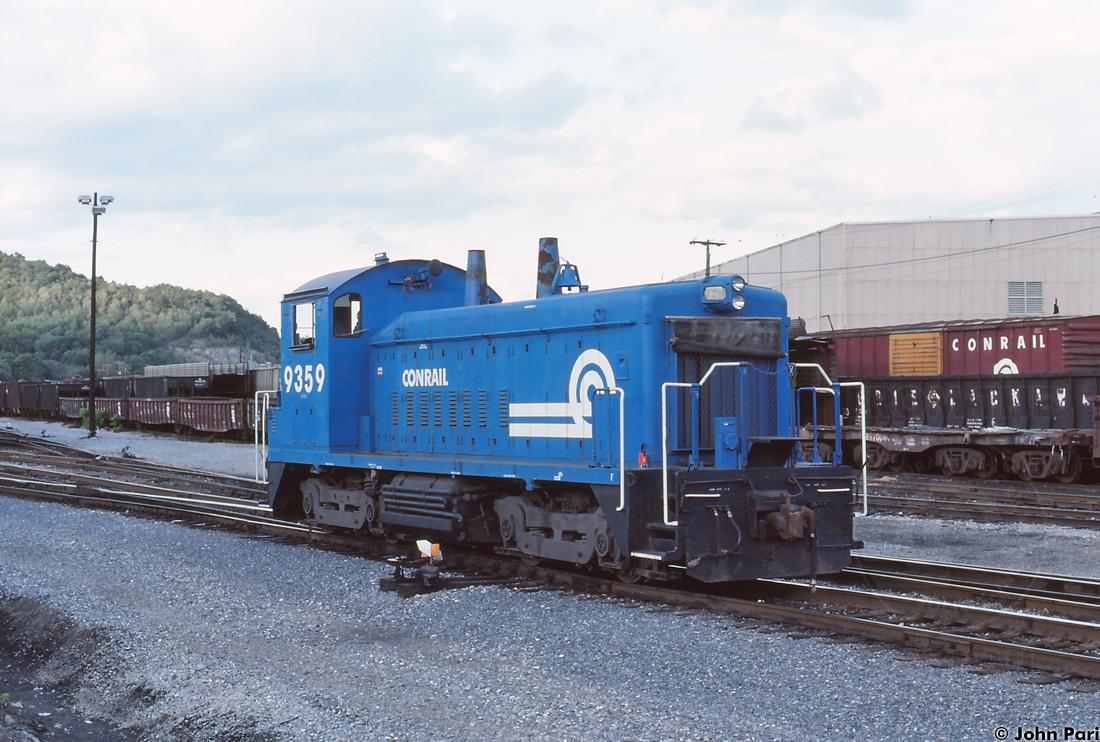 This July 1988 view of CR 9359 illustrates part of the massive assortment of cars that could be found in Hollidaysburg during the Conrail era, such as the 8-truck flatcar to the right (CR 770044).
