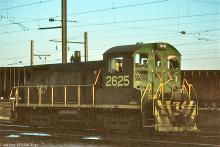 Still in RDG colors, SW-1001 2625 (CR 9400) works Morrisville yard in April, 1977.