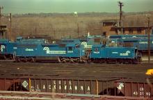 CR SD-45-2 6664 (ex-EL 3679) and SW-1001 9406 (ex-RDG 2606) mixed in with lines of CR blue power at Enola in September, 1983.