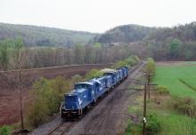 An eastbound Conrail light engine movement rolls down the valley near Port Clinton, PA on May 2, 1987. The head five units came out of St. Nicholas and the trailing unit, SW1500 No. 9529, was picked up at Tamaqua.