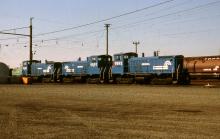 Three consecutively numbered SW-1500's (9592, 9591,9590) rest between assignments at Greenwich yard in Philadelphia, PA. March 9, 1985