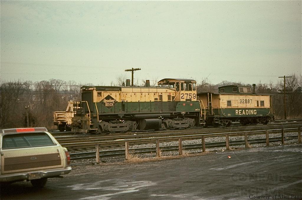 RDG SW1500 2759, soon to be CR 9598, is coupled to N4 class cabin 92887(CR 18752) as they work the Abrams yard. This cabin would later be preserved by the United Railroad Historical Society of NJ. It is stored at Ridgefield Park. The 1972 Ford Country Squire station wagon was one of many railfan's vehicles present at Abrams on this President's day in 1977.