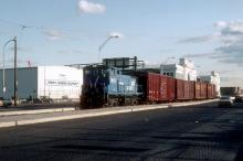 Conrail switching Pier 38 on Delaware Ave (Christopher Columbus Blvd), Philadelphia waterfront, September 1991. Just visible at left is the end of the wire for the BVTA trolley operation that was still there at the time.