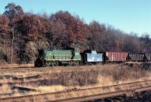 An ex-Reading MP15 and an ex-PC N5 caboose make up this scene in PA's hard coal country.