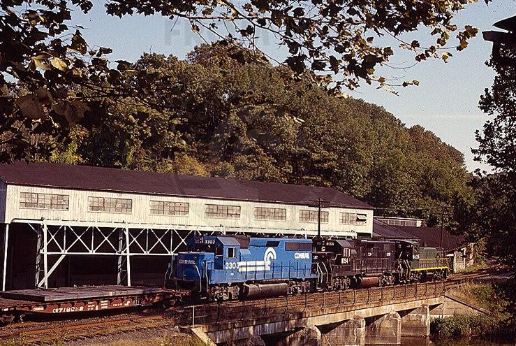 In September 1981, Conrail MP15 9625 leads the 8154 and 3303 with a train on its way back to Reading, PA from Coatesville, PA. The Coatesville turn operated out of Reading using the former Reading's Wilmington & Northern branch. At this point the primary customer was Lukens Steel. A fair amount of cars also went Luria Brothers scrap yard both hauling scrap or to be scrapped themselves. With Conrail, traffic to Wilmington was rerouted and this train would soon be abolished in favor of using a connection to the former PRR just east of this location. The W&N would be abandoned starting just west of here to Birdsboro, PA.