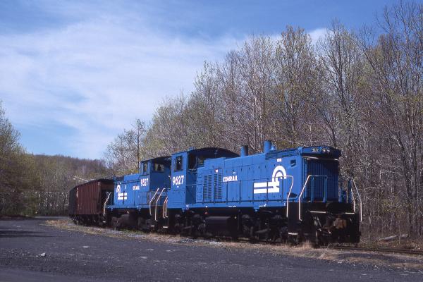 Conrail ran an interesting light engine move on Saturdays. It originated at St. Nicholas, gathering all the power there. As it proceeded east, a stop was made at Tamaqua to pick up the lone unit assigned there. At Port Clinton, it reversed its movement and headed west to West Cressona and picked up their units. Now totaling between 8 and 10 units, it proceeded east to Reading and then west to Enola Yard. At Enola Yard, the power was serviced while the crew took rest. Once rested, the crew did it all again, in reverse. On Saturday May 2, 1987, the crew is about to begin the odyssey at St. Nicholas with four MP15s and a GP10.