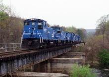 An eastbound Conrail light engine movement crosses the Little Schuylkill River near New Ringgold, PA on May 2, 1987, led by MP15 No. 9627.