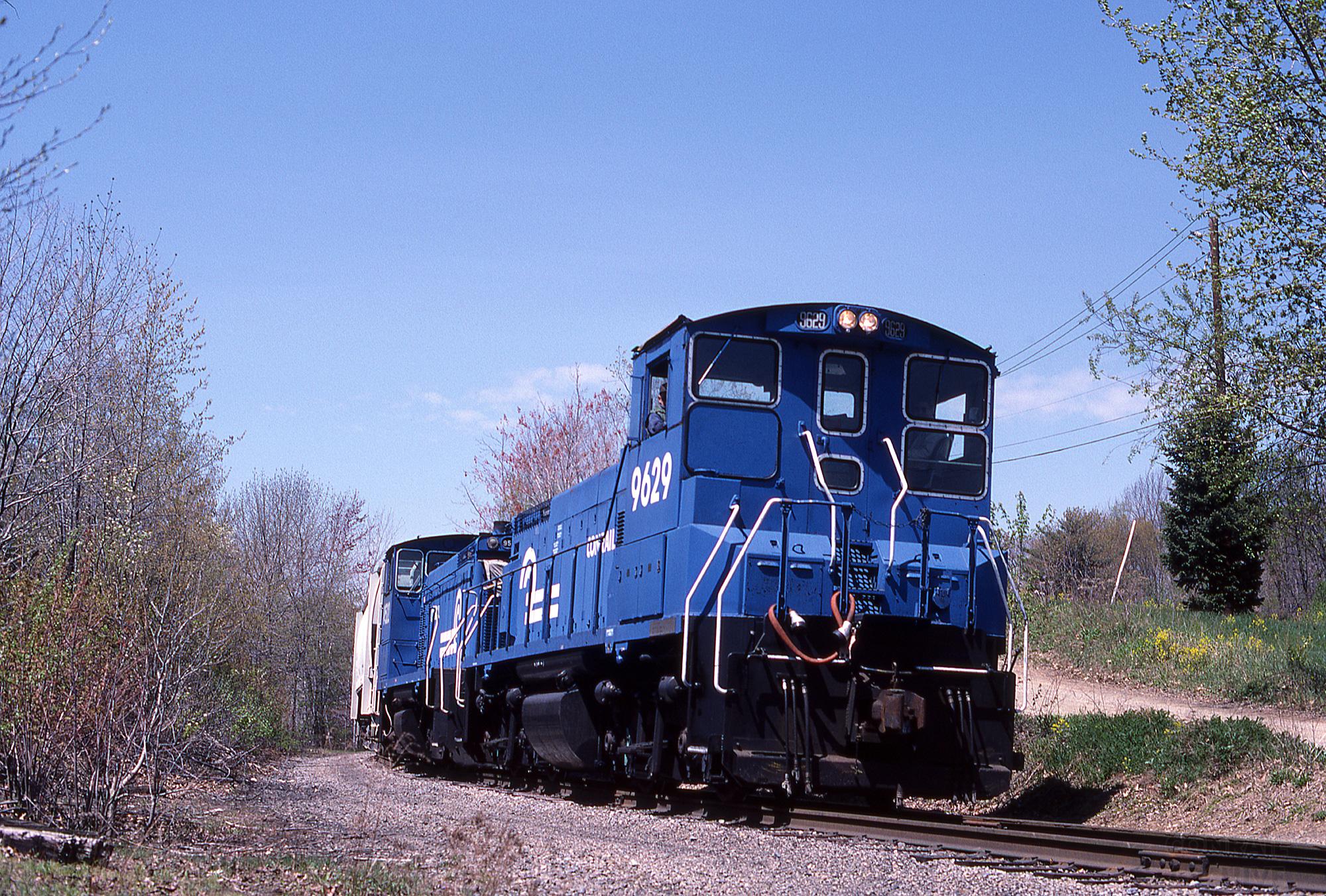 Eastbound Conrail Local WHWC02 drops downgrade into Minersville, PA on May 1, 1987 with MP15 No. 9629 and SW1500 No. 9522.