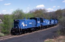 Westbound Conrail Local WHSN03 passes through Locustdale, PA on April 30, 1987 and starts the serious part of the climb up to Locust Summit.
