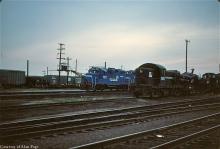 Late in the day at Morrisville yard in April, 1977, CR GP10's 7572 and 7574 pass by a line of stored, or retired, units including PC RS1 9902.