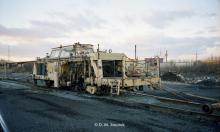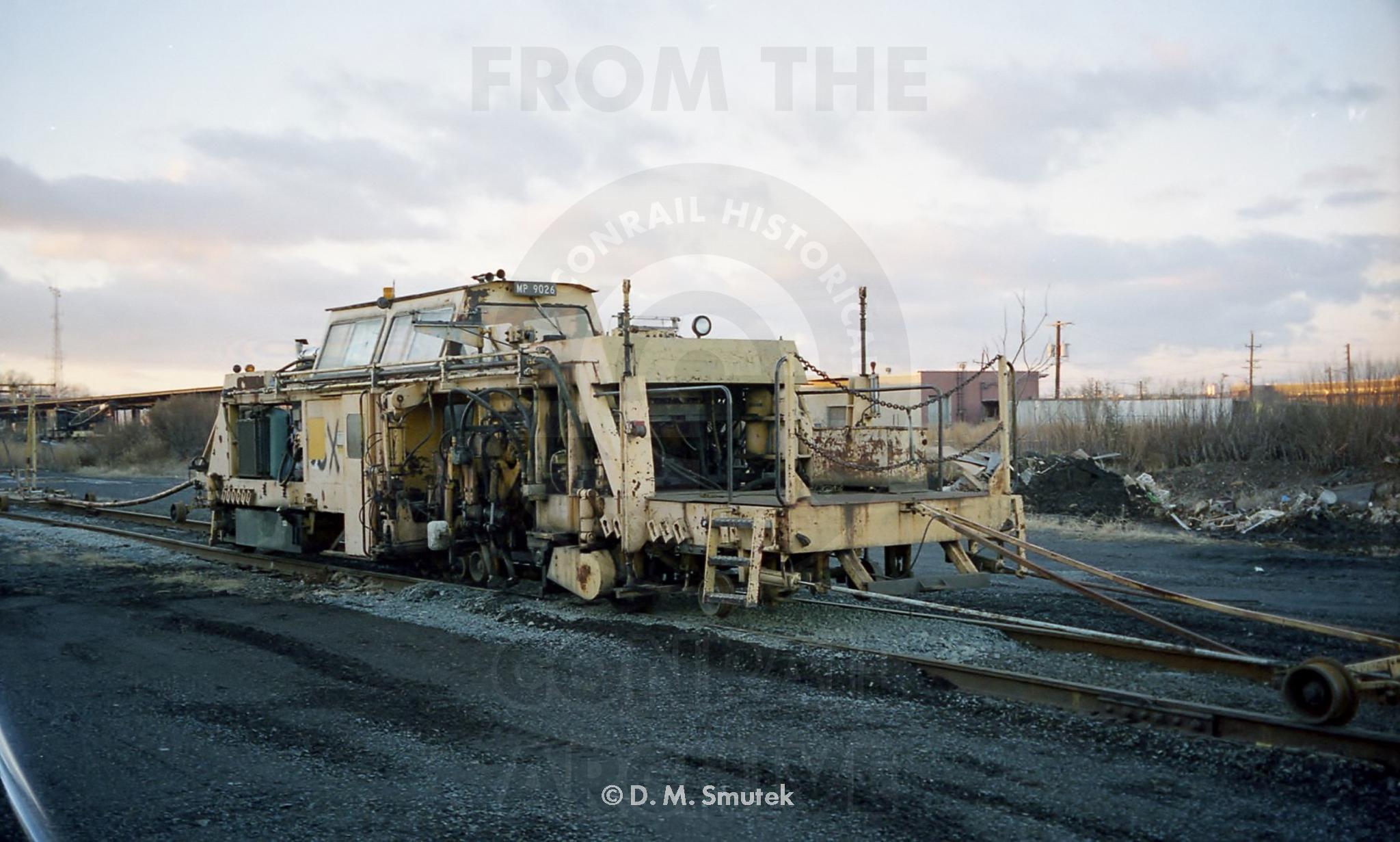 MP 9026 is sitting in the former CNJ Elizabethport Yard in the fall of 2001. This wasa Plasser American Universal Yard MasterUYM 8-L switch tamper.
