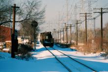 Conrail hot metal train on the Bernice Cut-off just north of Burnham Crossing in February 1989. It was very rare back then to find one of the hot metal trains running without a caboose. Doug Davidson photo with permission