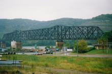 Previous Next Photo By Doug Davidson The massive Conrail bridge over the Ohio River between Steubenville, OH and Weirton, WV on Sept. 27, 1994. Doug Davidson photo with permission Year 1994 Original Date 9/27/94 Location Steubenville OH Additional Galleries Doug Davidson's Midwest Conrail action Collection CRHS Conrail Photo Archive Contributions