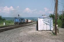 Conrail's BUOI is crossing over from track #2 to track #1 at CP Horn to avoid track work on track #2 further to the east. This was due to Conrail's single tracking and upgrade project on the Southern Tier Line. Rail train RAI-338 had just cleared track #1 at Browns Crossing to the east, allowing BUOI to proceed.