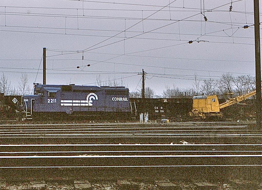 Beside a CR Burro crane, former PC GP-30 2211 works Morrisville yard in March, 1979.