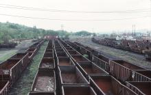 An overview of Rose Yard in Altoona, PA on 6/7/97, shows many stored cars that includes 3 bay coal hoppers as well as other rolling stock.