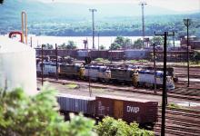 D&H GP39-2 #7603, ex Reading GP39-2 #7416, GP39-2 #7612, ex Reading GP39-2 #7406 & GP39-2 #7617. Enola engine terminal on July 15, 1976. Enola provided many types of power over the years. The D&H freight would go north on the P&E later in the day.