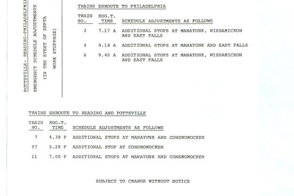 RDG Division Conrail notice for Pottsville to Phila Septa TWU strike adjustments March, 1977