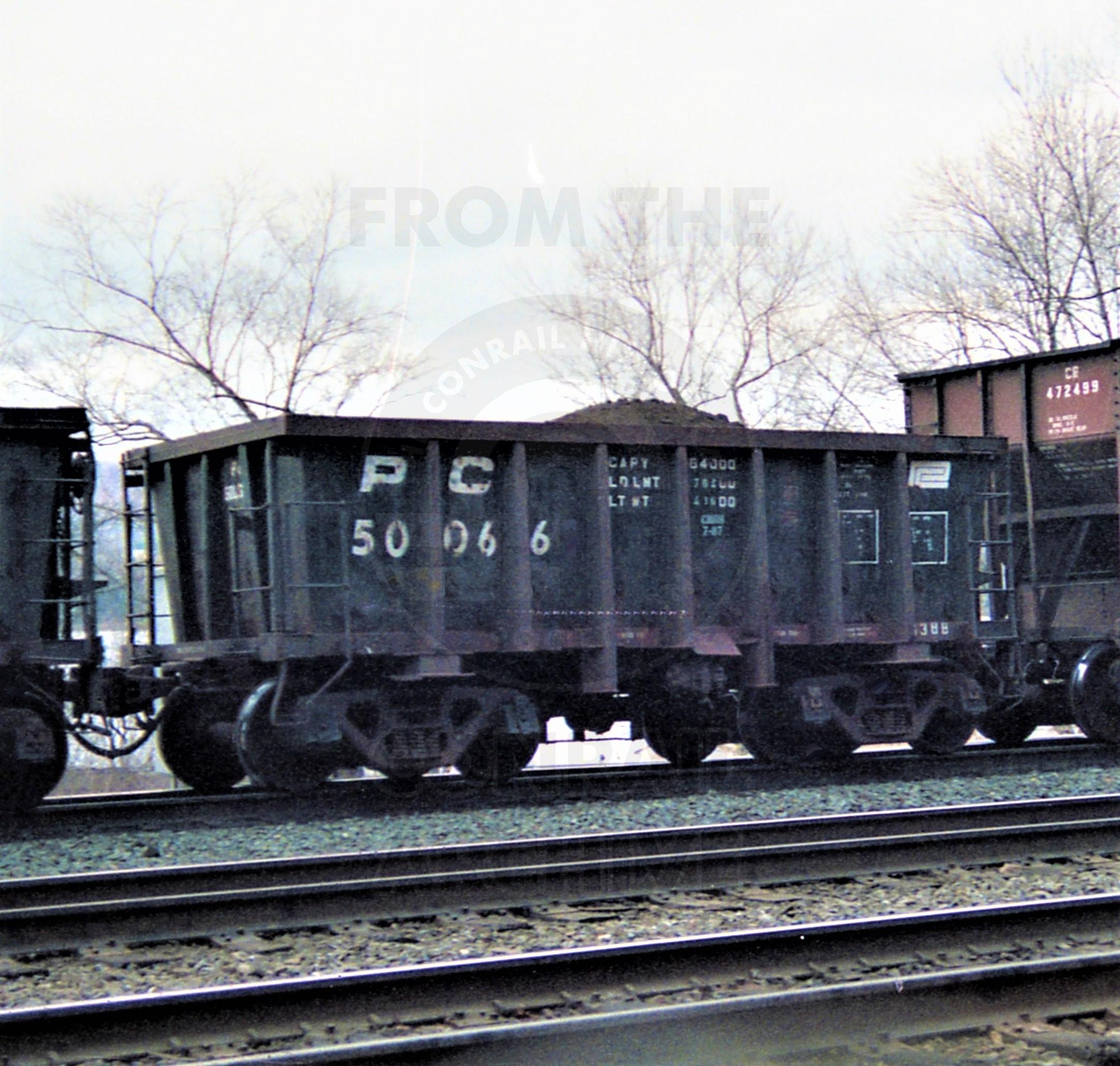 Conrail. Ex Penn Central G38 low ore car #50066. On Middle Division freight in March 1983