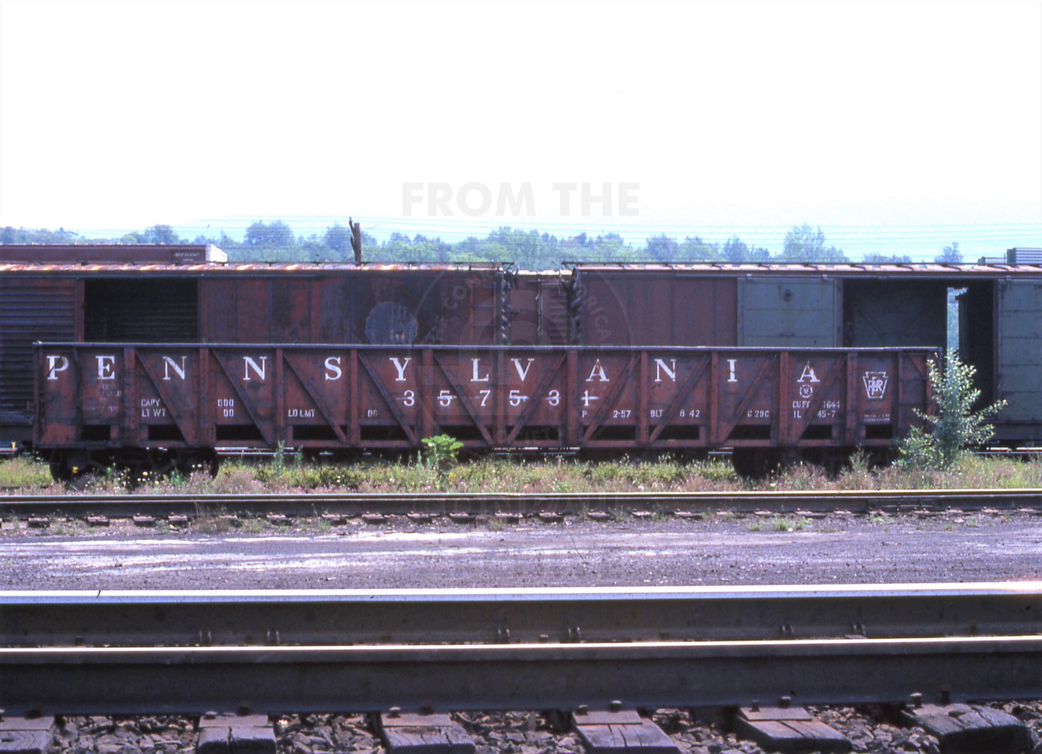 Ex Pennsylvania Railroad outside brace gondola #357531. Altoona, PA scrap line. August 15, 1977