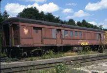 Conrail. Ex PRR/PC Railway Post Office car #28157. Altoona, PA scrap line. August 15, 1977