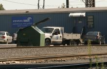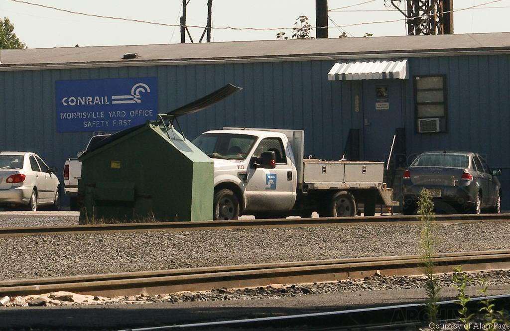 No signs of the new owner outside the Morrisville yard office in August, 2014 as a Ford maintenance truck shows the Conrail logo.