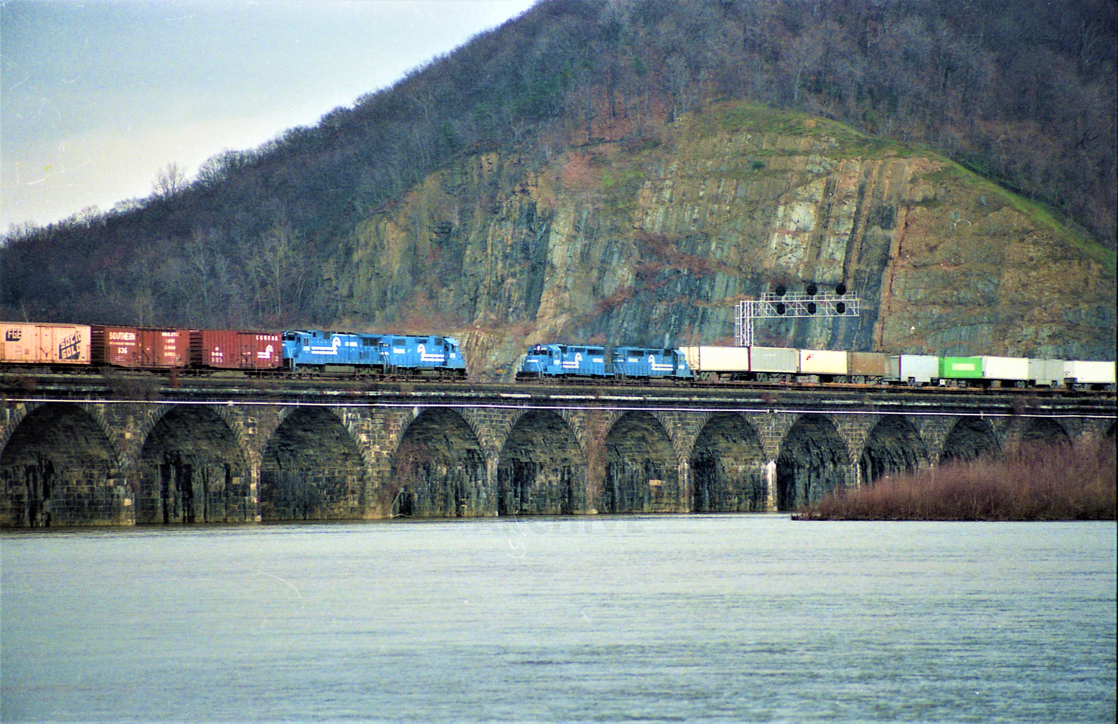 Train meet on the Rockville Bridge. Susquehanna River, April 18, 1983