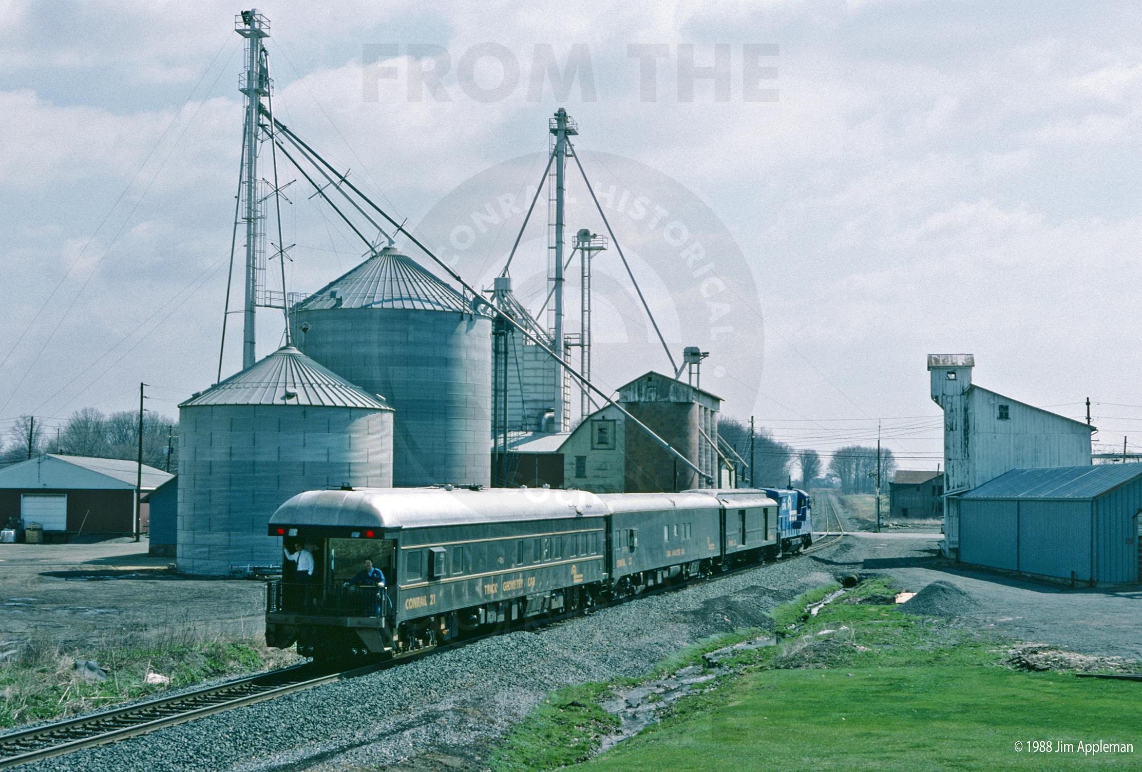 The Conrail geometry train works its way east by Clark's Feed Mill approaching the PA Rt. 44 crossing on the Watsontown Secondary. Except for the gray and red with white gable end steel buildings, all structures in this view are now gone.