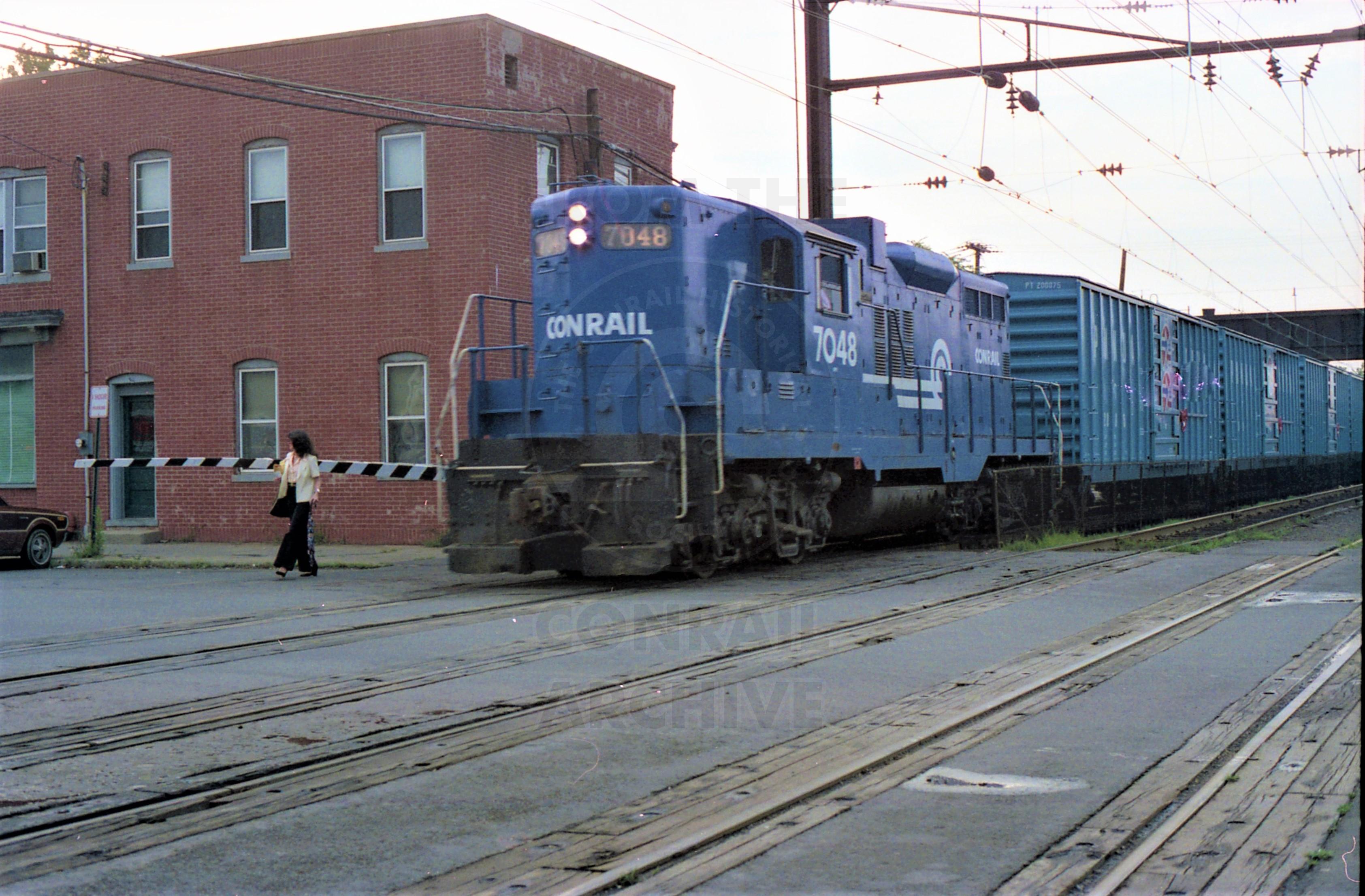Conrail freight at South Amboy, NJ. GP-10 #7048, with freight heading east (south) and is going to old Raritan River Railroad trackage. August 21, 1980. South Amboy, NJ was a great place to watch & photograph the engine change from electric (GG-1) to diesel (E-8) back in the day. The occasional freight was always a treat to see, since this old New York & Long Branch trackage was mainly a passenger route to the Jersey Shore. The building in the background is the old Raritan River Railroad general offices.