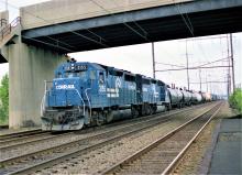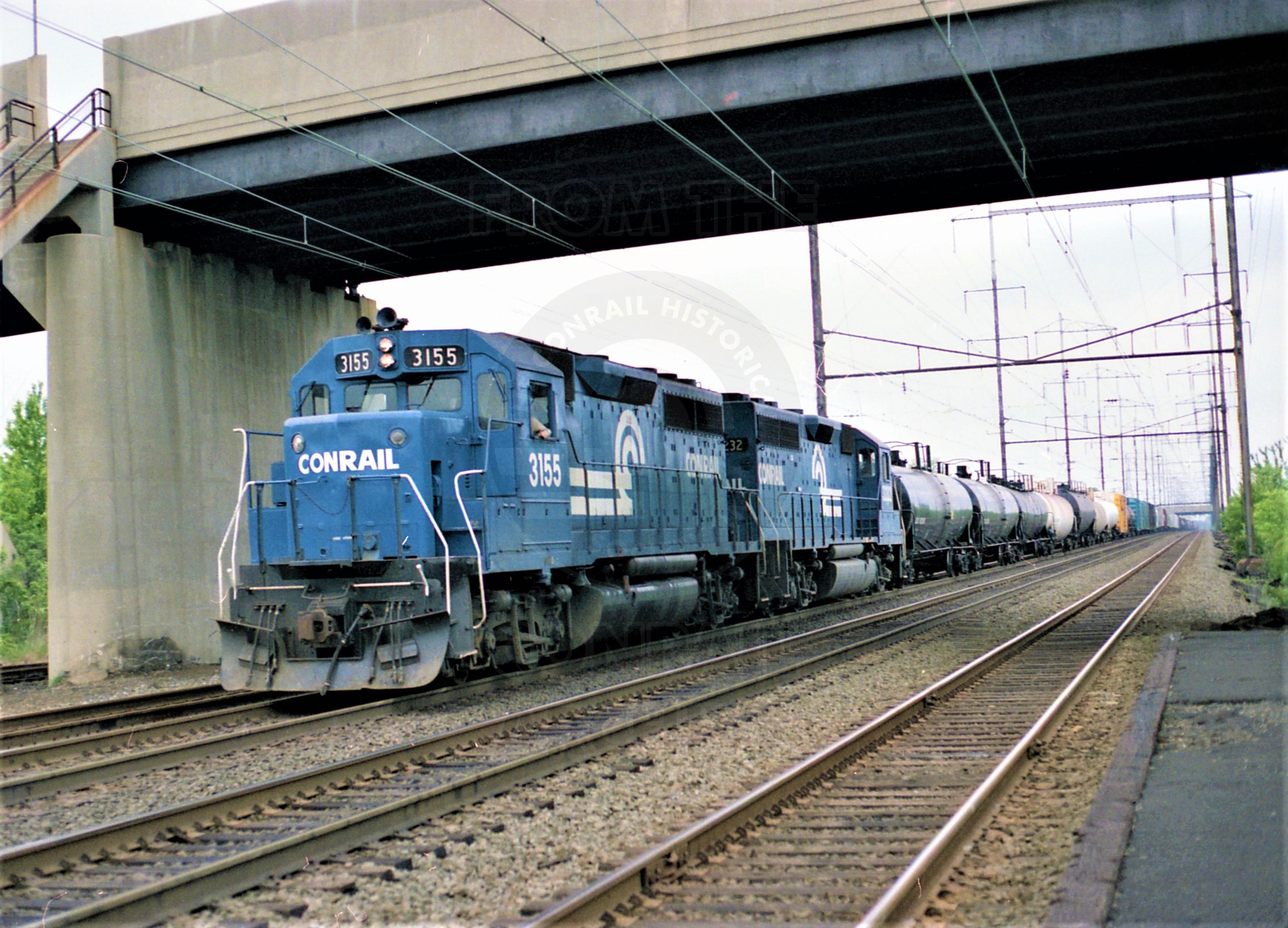 Conrail GP-40 #3155 & 3232. Westbound freight is on track 3 at Adams Station, North Brunswick, NJ. The date of the photo is June 28, 1983