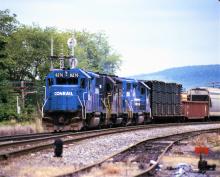 GP-40 #8276, N&W unit & Conrail unit near Harrisburg, PA. Train is from Hagerstown, MD. July 16, 1986. I guess this was a preview of things to come!