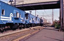 Adams Station, North Brunswick, NJ. New Conrail N-21 cabooses #21302, #21301, #21300. Eastbound freight on Sept 28, 1980