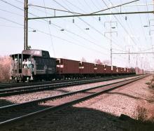 Conrail caboose N5C #23066 on eastbound Amtrak rail train. Adams Station, NJ. December 1978
