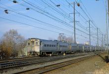 An octet of CR-operated NJ Transit Arrow III NJ MU's, led by 1455, streak through Morrisville in November, 1979.