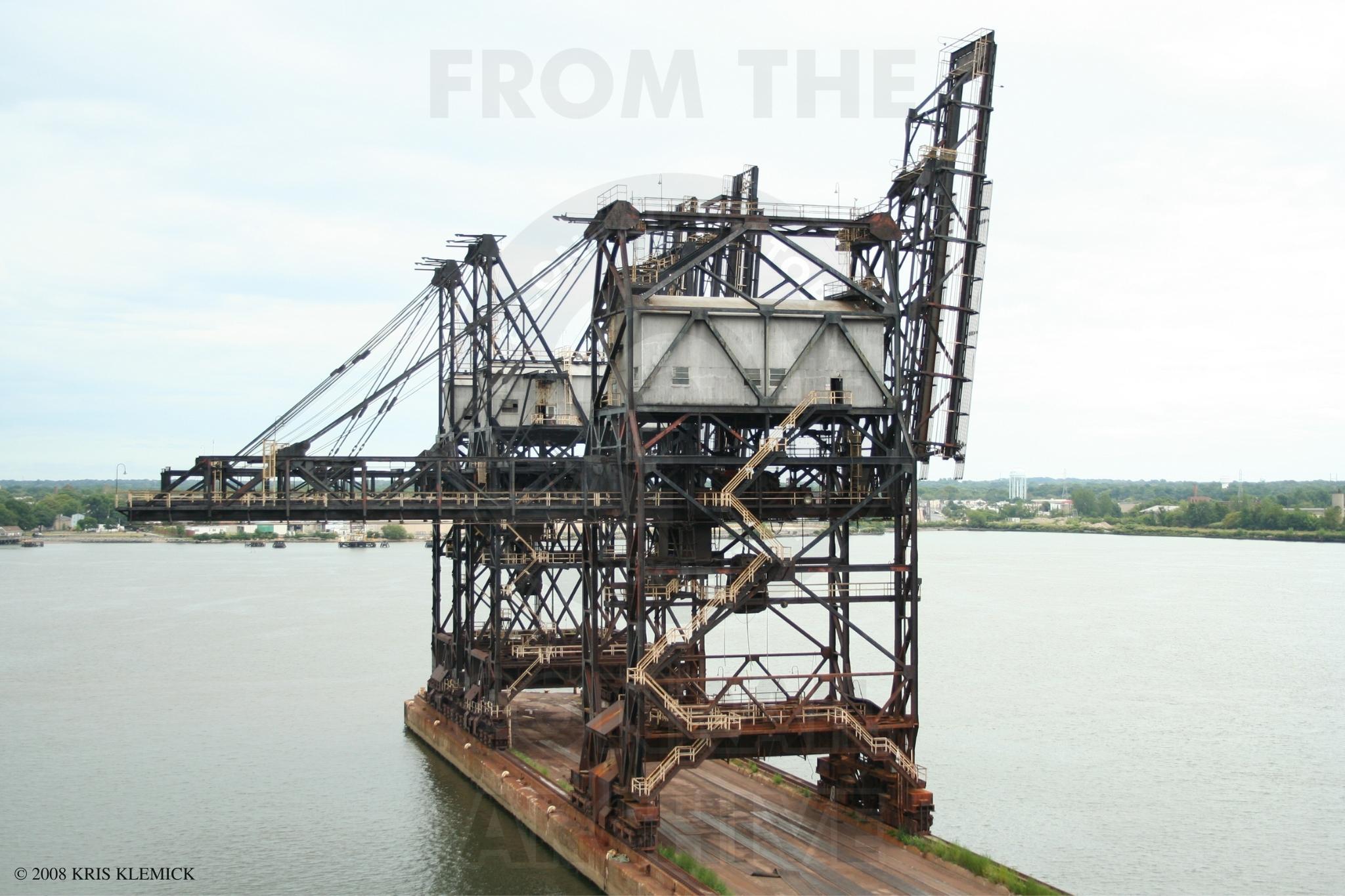 This view was captured from the northern end of the western-most traveling crane #4s lowered arm looking east at cranes 3, then 2 and 1. From this perspective you can see the visual difference between the original cranes 1 and 2 and later cranes 3 and 4 that were added in 1955-1956.