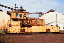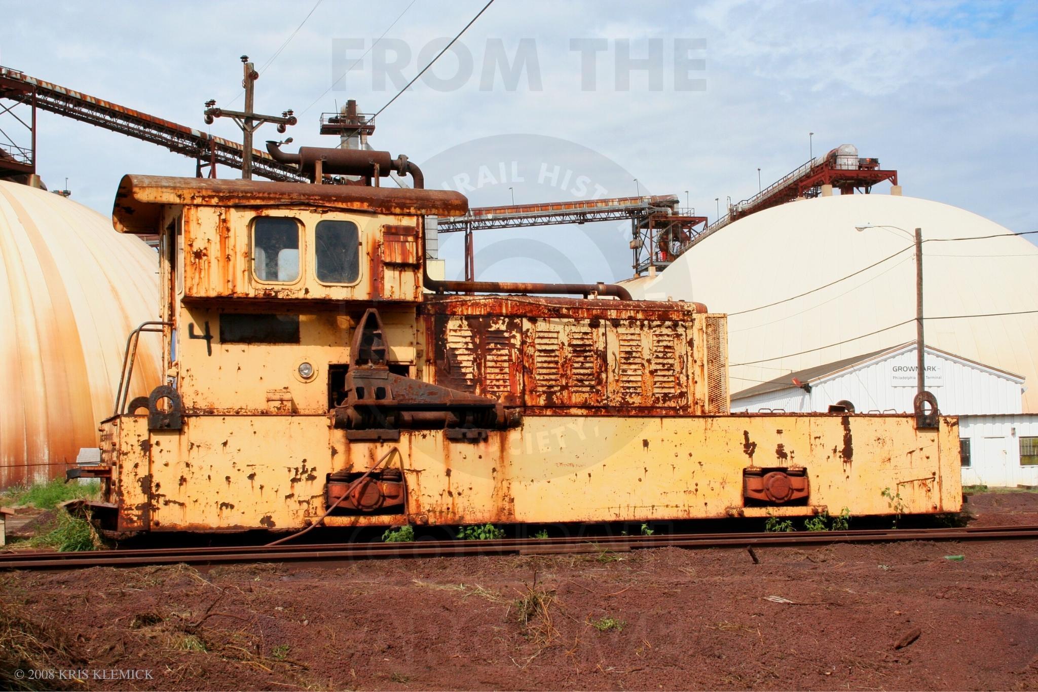Previous Next Back on the ground with narrow gauge shunt engine #4 with its rusted pneumatic arm that was used to push standard gauge ore jennies around the double track loop. Photo By Kris Klemick Year 2008 Original Date 8/29/08 Location City Philadelphia PA Collection CRHS Conrail Photo Archive Contributions