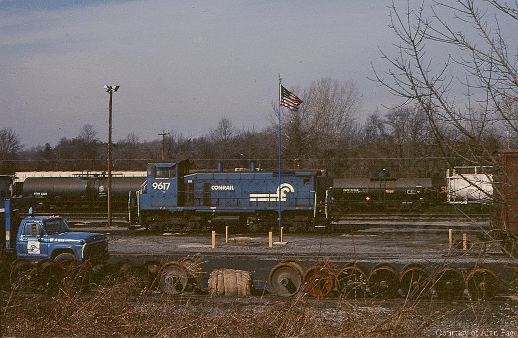 With CR Ford truck S1123 parked nearby, CR SW-1500 9617 (ex-RDG 2767) rests at the Abrams engine terminal on President's Day in February, 1982. The Conrail crews even painted the flag pole CR blue!