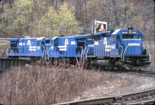 SD40-2 #6440, B36-7 #5009 & 5003 on Rockville Bridge approach . Light power going to Harrisburg yards on April 28, 1984