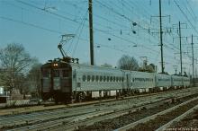 Former PRR MP85B 219 leads a quintet of Silverliners through Morrisville in April, 1977 during the 44-day March 25 to May 8 Septa City Division transit strike.