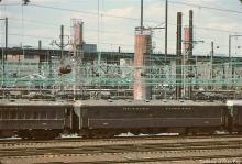 RDG MU 895 follows lead unit 857 as CR GG-1 4937 backs a long string of 1929-1930 vintage MU's into Philadelphia's 30th Street Station during the 44-day Septa TWU strike in April 1977.