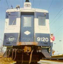 RDG MU 9120 waits on Sunday for the commuter runs to begin Monday morning from Warminster Station to Reading Terminal in November, 1976. Although all was quiet as the line of MUs waited for the Monday rush, my buddy and I would not have attempted the picture with todays security and safety. We meant no disrespect to Conrail by the picture. (Ektachrome large format slide from a Brownie camera)