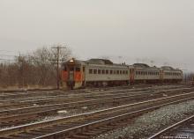 Still lettered Reading Company, a trio of CR-operated RDC's race through Abrams yard in February, 1977.