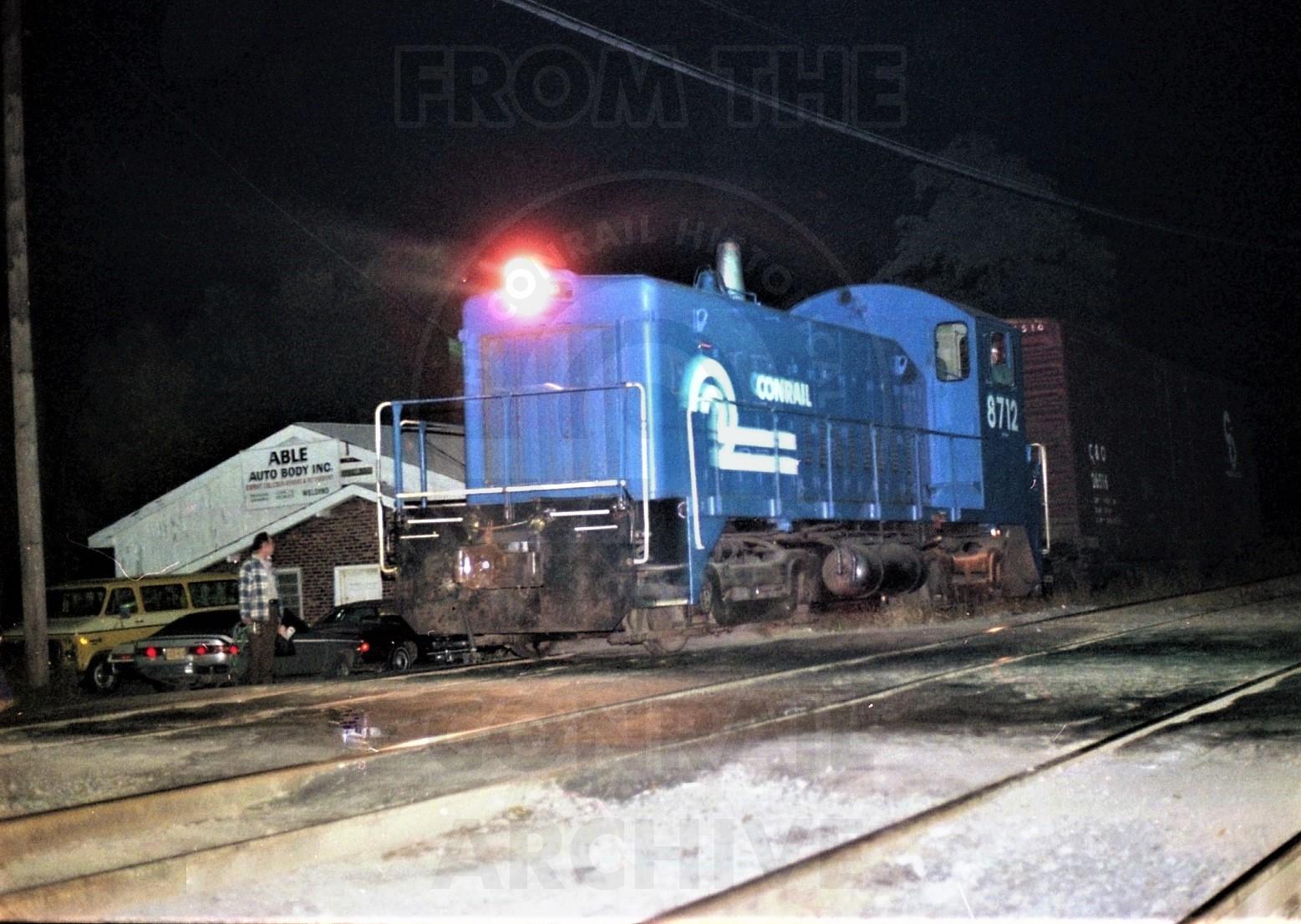 Conrail. Ex Reading SW-900 #8712 switching cars in the evening at New Market Road. The trackage at the crossing had 3 tracks, but the siding was removed in the late 1980's. This is in Piscataway, NJ. The date is early October 1981. The trackage was the Lehigh Valley main line and was Conrail's main line from Allentown, PA to Oak Island yard near Newark, NJ