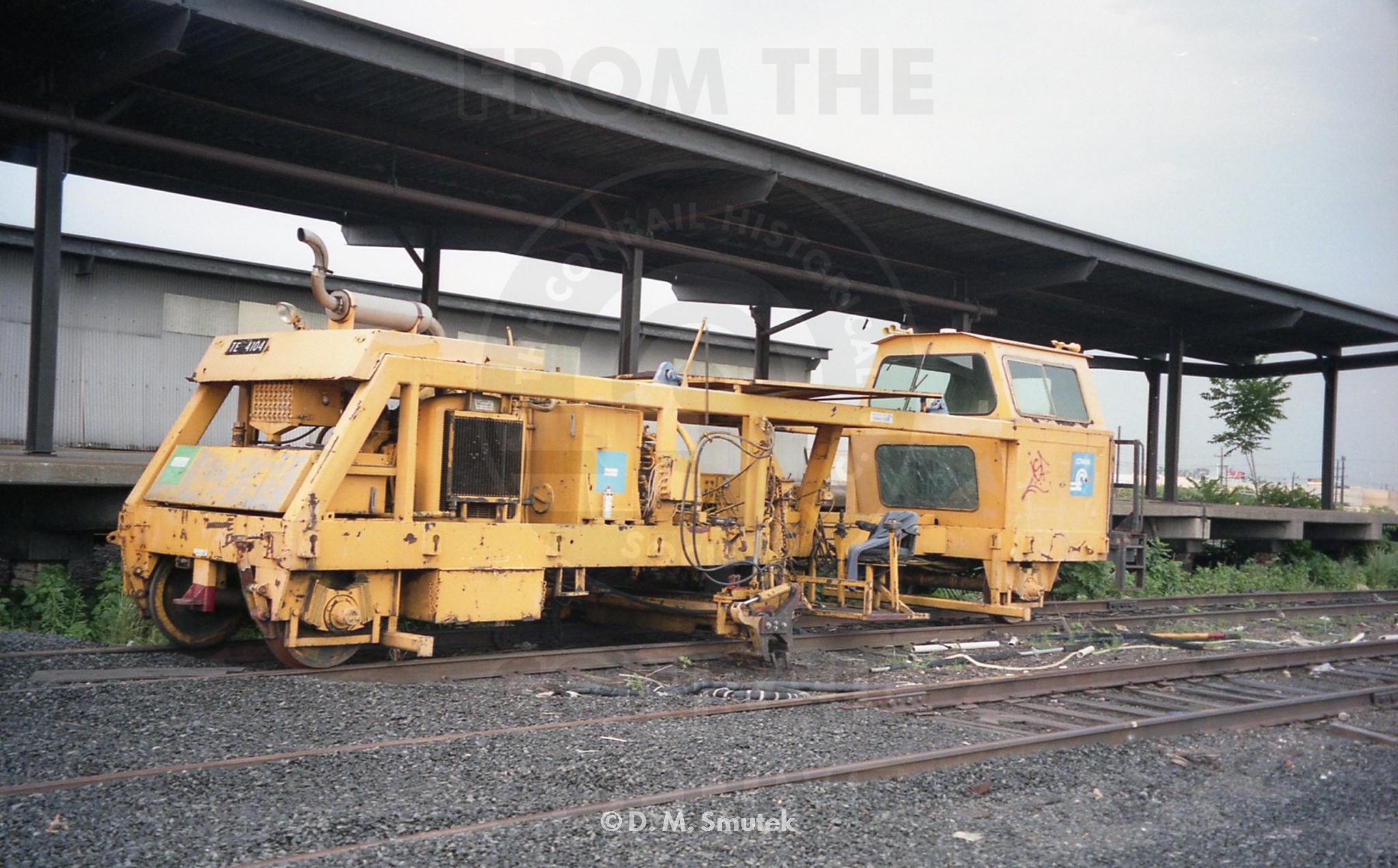 TE 4104 is seen inthe former CNJ yard in Elizabthport NJ duringthe spring of 2000. This was a Tie Remover / Inserter mountedon a Plasser American production tamper platform. The tamper functions wereremoved during the conversion. Conrail had several of these repurposed machines and were most likely rebuilt at the System Maintenance of Way Shop in Canton Ohio.