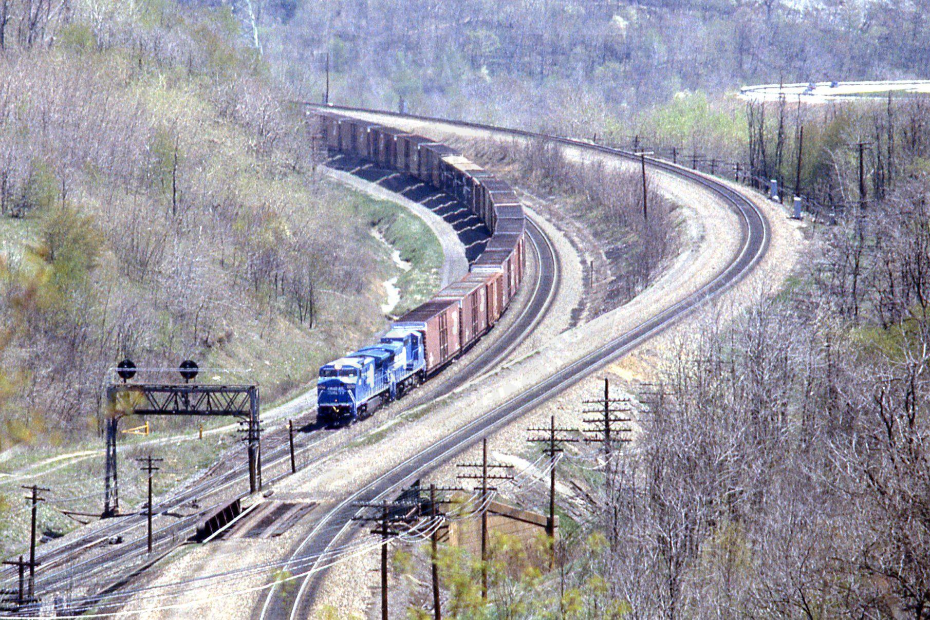 Previous Next Photo By Rich Bowes CR Train Pittsburgh Line Allegheny Twp PA at "SF" Year 1991 Original Date 4/1/91 Location Allegheny Twp PA Additional Galleries Rich Bowes' Conrail Photographs Collection CRHS Conrail Photo Archive Contributions