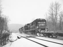 Clear view of C30-7A 6561 in trail due to empty flat in TV9 at Ballou's in Washington, MA. on Dec. 30, 1989.